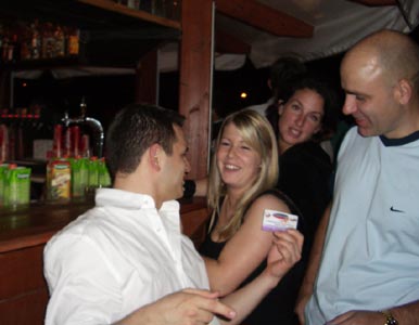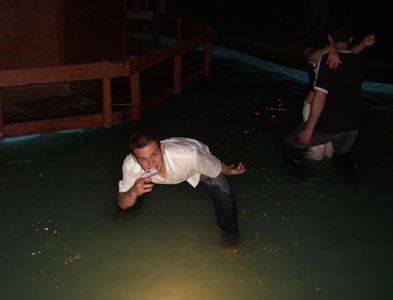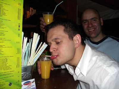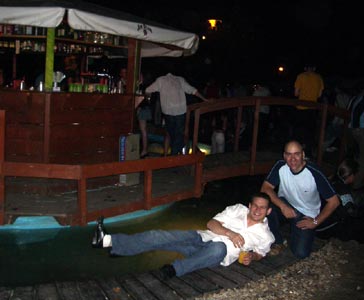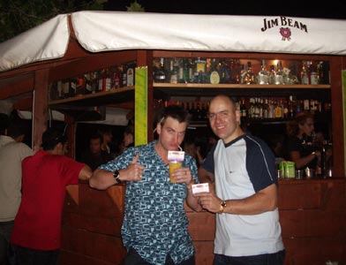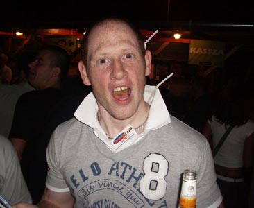We learned of another outdoor club round the corner from Rio called the Garden Club, so Steroid, Eggergizer, Banana Bunch, Water Boy and Hero set off to see if anything needed watering while the rest partied on in Rio, the casino and anywhere else they had ended up. This place was huge with four different open air arena’s, one of which featured a wooden beach bar in the middle of a shallow moat of water and it was here Water Boy was born. After Hero severely pissed off the barmaid by sticking every straw he could find in every orifice on his head, Water Boy decided to go for a paddle. Here he was, splashing around in the water like a new born duckling, fully clothed, shoes still on, the lot. The ‘natives’ were out in force tonight and after getting a whole load of dodgy looks from them, we thought we’d take things one step further and introduce them to Clubflat. “Take a picture of us in front of these toilets” Hero screamed as he chucked the camera to a confused couple who just looked back with blank faces. “You vont pic-a-ture in toilet?” came the baffled reply. “Yeah!! We’re toilet spotters” we told him as his missus scratched her head in confusion. Meanwhile on the other side of Budapest, the Clubflat antics continued elsewhere. Memphis, Quick Buck, Bluff, Fitness First and Shag decided to indulge in a session of wrestling in the midst of some deep, dense flowerbeds, right on the sidewalk of the main route through the city. Unfortunately no pics prevailed, but the video footage taken was legendry. With Memphis shouting “Easy, Easy” Big Daddy style, he quashed all victims until they were begging for mercy. The next day there were newspaper headlines of aliens that had landed and left huge crop circles in the centre of Budapest, but we all knew this was simply down to the odd shape of the infamous Memphis Belle. |