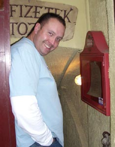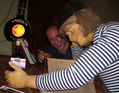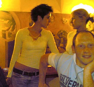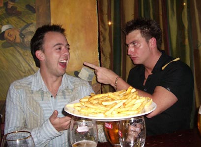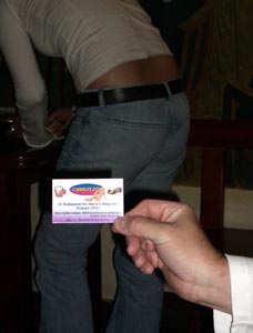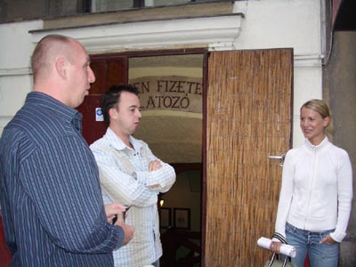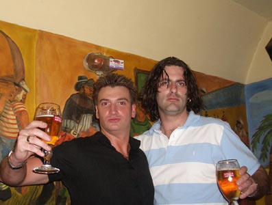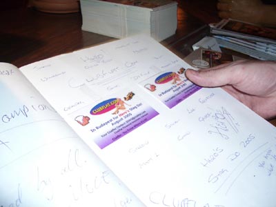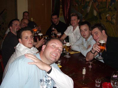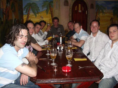 On the final evening, the remaining days of Hero’s freedom was celebrated (again) with the “Stag Dinner” where Hero and 17 of his finest pals sat together for a momentous meal. Things looked good from the start when to take us out for the meal, Shag’s object of affection, Agi turned up with the lovely Andrea, yet another different stunner from Budapest Weekends. They sure have one hell of an employment policy at that place! One round of Stella’s arrived followed soon after by another, which was a sign of things to come. As the food arrived, everyone was in fits of laughter as DJ Fukup didn’t hold back on his etiquette and cried out “WHAT THE HELL IS THAT?”, pointing to the most dodgiest strip of gammon the world has ever seen! The look on the waitresses face was priceless as she attempted to continue to serve. Well that outburst started the bidding. Memphis got up to his usual tricks and before long the place had been well and truly Clubflatted with cards appearing everywhere from ceiling extraction fans to Hero’s arse crack. After making a lasting impression on the place, it wouldn’t have been right if we’d left without signing the guest book and of course leaving a few Clubflat cards in it for good measure. Well if there’s one thing that came of the Stag Dinner, it was that Clubflat, the restaurant owners sure knew where it was at! See ya next time! |