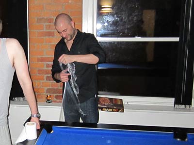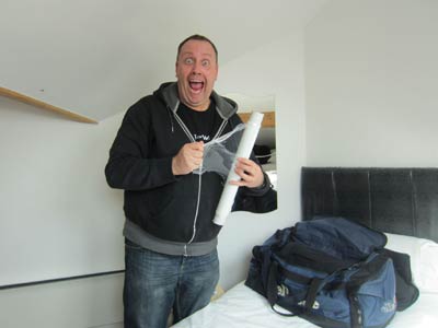 On arriving at the penthouse we discovered the pool cue had a split in it right in the middle where the two ends join, making it unusable. That was until Mentalist Dad cracked open the industrial sized cling film he had in his bag and repaired the joint. But despite playing with a cue wrapped in cling film for two days, Guitar Hero still didn't cotton on. He neither asked where we'd got it from or had any suspicions that we'd actually brought it with us... and for what purpose. As Guitar Hero drifted into a slumber after a late Saturday night out on the town, he was rudely woken by seven lads bursting into his room to pin him down for a good cling-filming. Unfortunately the Team in their drunken state hadn't been as quiet as they thought sneaking to Guitar Hero's room and had stirred him from his sleep, which left him half ready for the onslaught. After some WWE style wrestling on the bed, the element of surprise was lost and the bed mission was a failure. But five minutes later Guitar Hero was caught unaware in the lounge and wrapped up on the pool table like a sandwich at a buffet. |