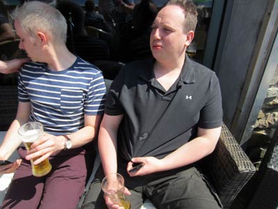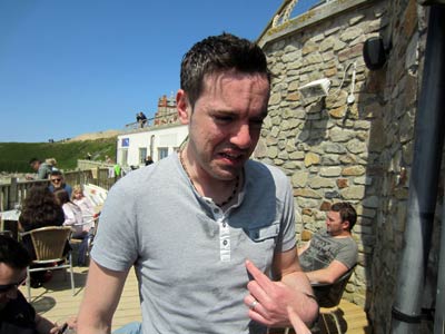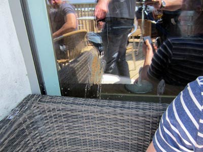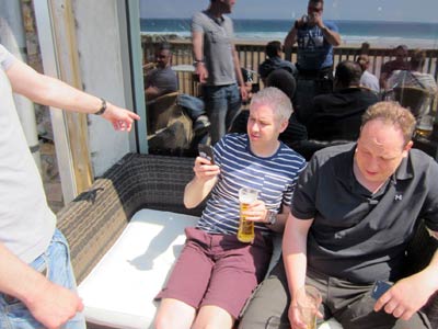 What a weekend to have a stag do in Newquay on. The sun was blazing, the 'skirt' was out in force and the bars were calling. Silly t-shirt shaped sunburn was guaranteed for the evening. As they wandered around Newquay, the 13 strong Clubflat Team had inadvertently split up into smaller groups. But it didn't take long for them to find each other again as they all came up with the same great idea, and gradually descended upon the best place in Newquay to be at on a day like this - the Fistral Beach Bar! From this vantage point overlooking the beach, not only can you admire the passing 'floss' from high up above whilst soaking up the sun, but you can do it whilst drinking beer. However one particular bird took offence to the blatant leering of the happily tipsy Clubflat Team and re-enacted her vengeance with military precision. With absolutely no-one noticing the impending doom, she swooped faster than a bullet and released her 200mph payload straight at easy targets Stu, Laze and Bluff who were just like sitting, err, humans. BOOM! went the bar window as an elephant-sized vat of bird shit rocketed in like a scud missile. Fortunately, like real scud missiles the targeting was a little off resulting in it narrowly missing Laze and Stu's heads. Had it been 2 inches to the left, Laze would have found a whole new meaning to the phrase "Eat shit and die". But the bird's mission was a partial success. The milky 'poo-juice' accompanying the main brown bomb had scattered across the three of them, much to the amusement of the others who were now looking nervously above them in case of a second attempt. |
