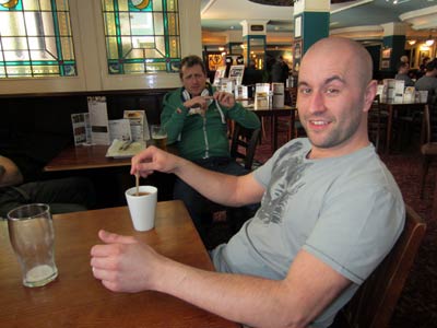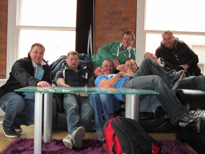 Driving was out of the question so a train journey from Wolvo to Manchester it was, but first a full English breakfast in Wetherspoons was needed to kick start proceedings. And kick start they did as the usual lads piss-taking soon began in earnest. As Hero rummaged in his rucksack the lads caught sight of the truck load of chocolate and crisps he had brought along which didn't help to disprove why one of his other Clubflat aliases is Fat Kid. Then as everyone supped morning pints, Special K was caught stirring a coffee after having been goading the others in the weeks beforehand that they wouldn't keep up with his drinking. Then there was Guitar Hero who turned up with a huge pair of head phones round his neck like he'd just finished a 'set' with Judge Jules. Meanwhile Steroid was throwing the Wetherspoons sausages all over the place as the tiny green specs of herb in them 'offended him'. The start of a beautiful weekend of male bonding was already forming... |