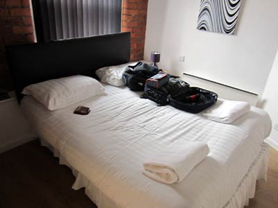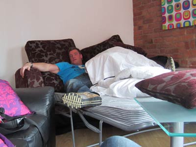 What better way to spend a stag do than to hire out a penthouse apartment as your central base. The City Stop Hotel is a newly converted set of apartments right in the heart of Manchester and directly opposite is a themed arcade of restaurants and bars known as The Printworks. Absolutely perfect to be able to roll out of bed and over the road into Wetherspoons for the morning hangover cure. The penthouse was at the top of the building and came complete with pool table. Fortunately the windows all round the lounge opened wide for within minutes the place stunk thanks to Eggergizer. In fact from that moment on the windows stayed open for the next three days. Well what do you expect with a group of semi-domesticated lads all sharing one apartment with no women there to nag! Even funnier was the fact that Biff-Edge and Steroid drew the short straws and had to sleep in the lounge amidst the mess, filth and the sweet aroma of shite. |