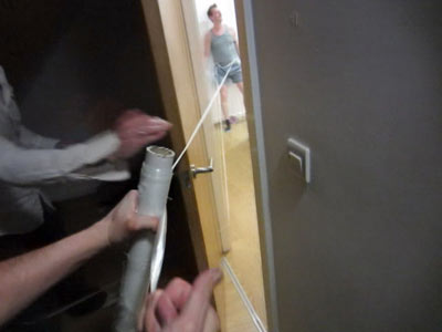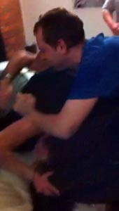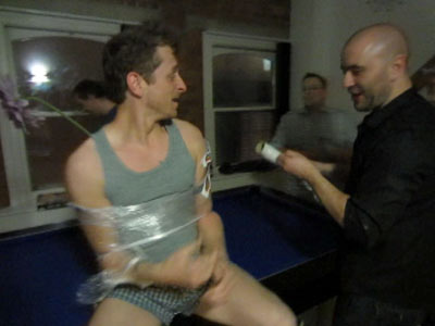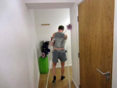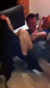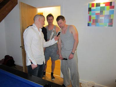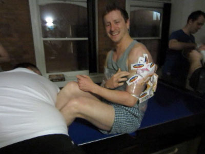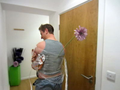 On arriving at the penthouse we discovered the pool cue had a split in it right in the middle where the two ends join, making it unusable. That was until Mentalist Dad cracked open the industrial sized cling film he had in his bag and repaired the joint. But despite playing with a cue wrapped in cling film for two days, Guitar Hero still didn't cotton on. He neither asked where we'd got it from or had any suspicions that we'd actually brought it with us... and for what purpose. As Guitar Hero drifted into a slumber after a late Saturday night out on the town, he was rudely woken by seven lads bursting into his room to pin him down for a good cling-filming. Unfortunately the Team in their drunken state hadn't been as quiet as they thought sneaking to Guitar Hero's room and had stirred him from his sleep, which left him half ready for the onslaught. After some WWE style wrestling on the bed, the element of surprise was lost and the bed mission was a failure. But five minutes later Guitar Hero was caught unaware in the lounge and wrapped up on the pool table like a sandwich at a buffet. |