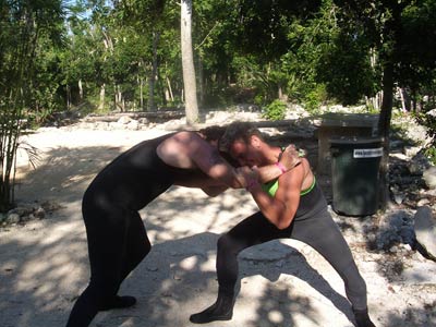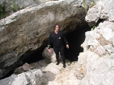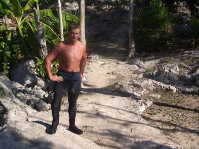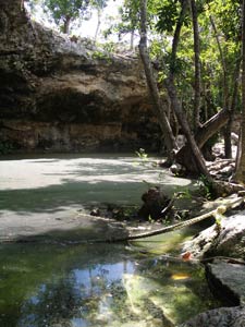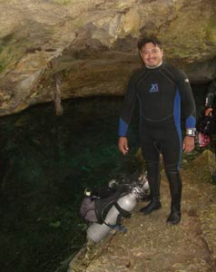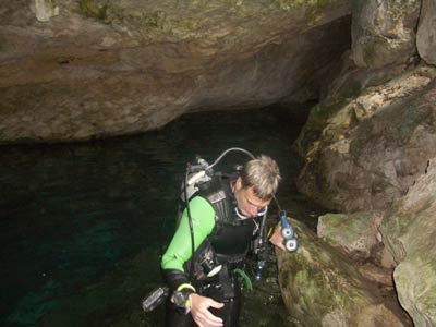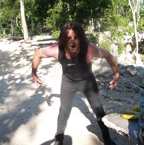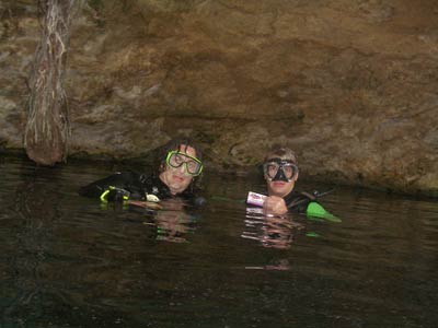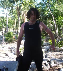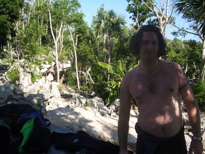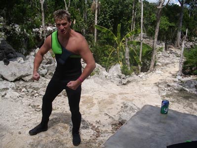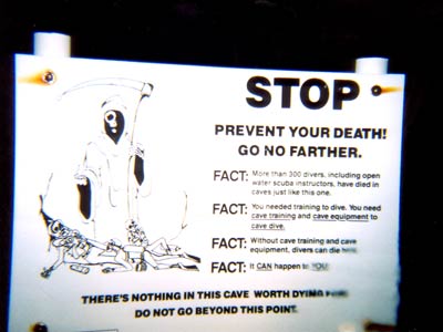 Mexico is probably the best place in the world to go cavern diving, with around 30 inland cenotes sites which are often little holes of water in the ground in some cave which you just jump into and explore. This undisturbed fresh water is crystal clear except for where there are weird hazes of salt water in places, which for centuries has become trapped in the fresh water and are known as haloclines. The experience of diving through a halocline is just crazy. As a comparison, open your eyes in a swimming pool with no mask and the fuzziness that you experience is almost as bad as swimming through a halocline with your mask ON! Pretty spooky as for brief periods you just can't see shit through your mask. Even more spooky was half way round the cavern, swimming underwater in the dark with just flashlights, we suddenly run into a sign with the grim reaper painted on it telling us we are going to die if we continue. Fab! But we continued anyway. After having seen a huge tarantula casually crossing the jungle dirt track earlier, we were prepared for anything! |