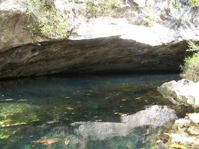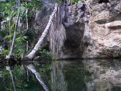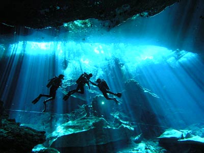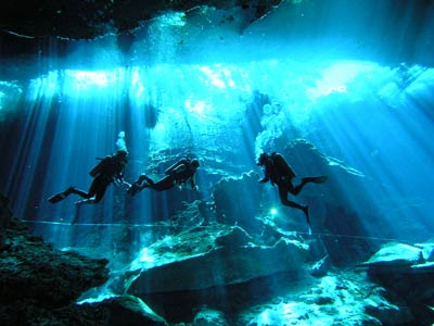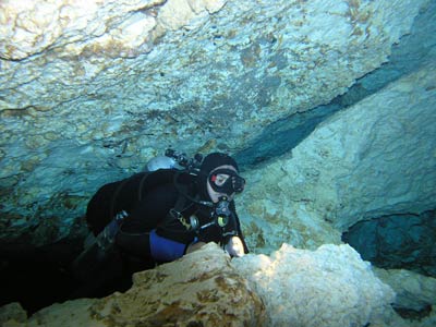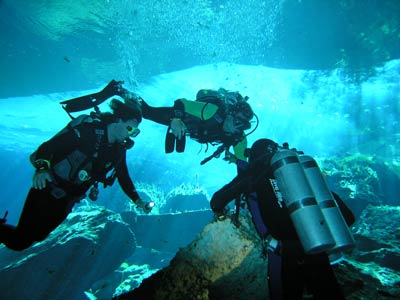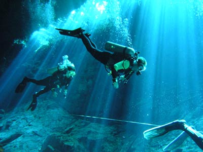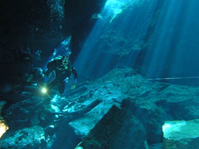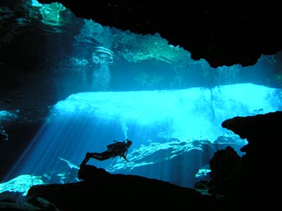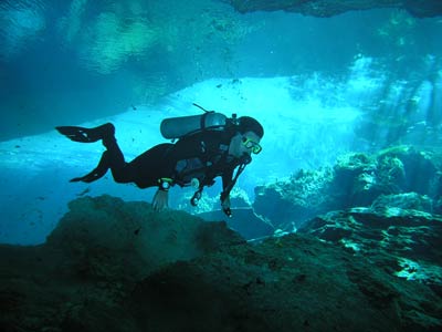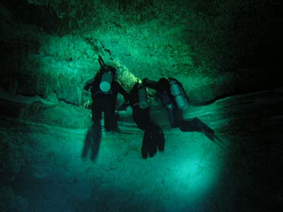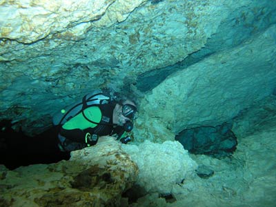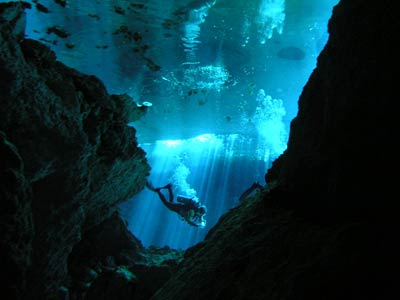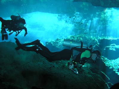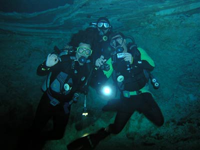 The same little pool of water down the steps in the cave was also used to dive the Kukulcan site. There is another larger entrance to this cavern outside but Pancho our Divemaster guide thought he'd take us the more difficult route, seeing as we seemed so confident. More difficult because you have to dive through a small gap in the rocks to get into the main cavern, but what fun that was! This felt like real cavern diving. Little did we know on this dive that a professional photographer was swimming around in the dark taking our pictures so he could wait for us to come out and charge us extortionate money for them! What a good idea he had cos when we saw the pics, we simply had to have them and you can see why! The pics even take away the actual darkness of the cavern the way they've been professionally exposed, but believe us, without your torches you'd definitely be in a whole lotta trouble. |