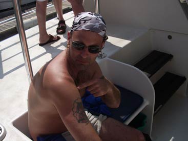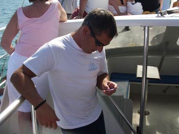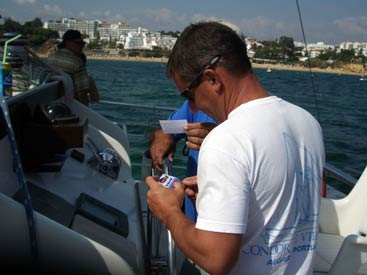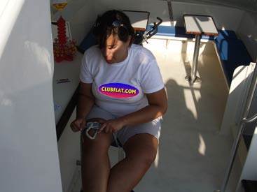 Clubflat went to Vilamoura, where the rich hang out, for an afternoon on a catamaran. Not the best of catamaran trips we've been on so we thought we'd liven it up. After the captain of the boat and his boat-hand (a Roy Schneider look-a-like from the Jaws movies) found the Clubflat cards that had been planted, Roy the boat-hand thought it would be funny to flick it overboard while smiling smugly at us. Bad idea. You just made it Clubflat's mission to plant as many Clubflat cards as possible around your boat. We put them everywhere, from on the boat charter clipboard, in the crisps, behind the bar, in the toilets, everywhere. Every time Roy found one, he would throw it, but it immediately got replaced. Roy also tried his utmost at not having his picture taken and was quite cagey about it for some reason, even threatening to throw a bucket of water over Hero and his camera. International terrorist we think. But the warnings went unheard and after 3 hours of persistence, he caved in, stuck the Clubflat card to his chest and smiled for the camera! He then even tried to get the third member of the crew, some miserable girl, to have her pic taken with the card - such is the addictiveness of Clubflat! However she was having none of it and wouldn't even look at the camera. Well there's more than one way to skin a cat, see pic! |