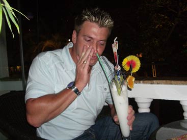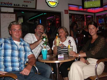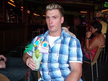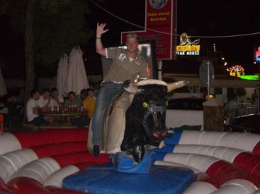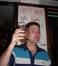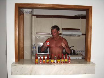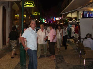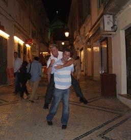 Albufeira has two great locations in which to drink away your evenings - New Town which has a mile long strip full of bars and restaurants, or Old Town which has a picturesque square with a large feature tree surrounded by bars and restaurants. Our favourite was definitely Old Town, there is just more going on. Street performers were abundant in both towns though, and New Town did have the added bonus of having a bucking bronco in 'Matts Bar', which Hero and Wolverand had several goes on much to the crowds delight. These things are so much fun, it would be a welcome addition to Clubflat! Going between New Town and Old Town are regular buses which we caught the one night as we didn't fancy the walk back. But this was a bus with a difference. The driver was playing loud clubbing music, it was in effect, a party on the bus! Something you'd never get in the politically correct UK, think of those poor pensioners. After the night in the town had ended, every night was guaranteed to end up at the local Snack Bar next door to our hotel for a few more cheap pints, until it shut at 3am. Then it was back to the hotel room for another drink and to count out all the Tabasco and Piri Piri sauce that had been thieved that night from restaurants. |
