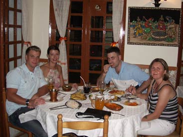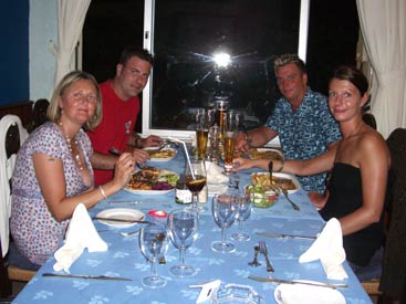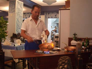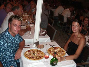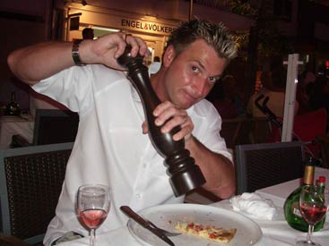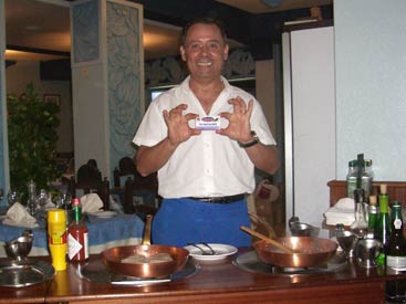 Clubflat began every night with a corking meal at some top restaurants. Ok, we slummed it in the English chip shop once or twice but then we needed an injection of being back home. There is some real quality food to be had and you'll see the best places to have it on this page. Top of the list is Augusto's where Hero claimed to have the best steak he has ever had, ever. Steak Diane, cooked in front of you by Augusto himself, it's amazing to watch let alone eat and it really gets your appetite going. As for the desserts, out of this world in both look and taste, just see the pics. Then at the opposite end of the scale we have Ramires restaurant. This place is renowned in the whole of the Algarve for it's Piri Piri chicken. It's an out of town place quite a taxi ride away in a small village called Guia where you mix with mainly locals, so the food is consequently cheap and not tourist inflated. It's 3 stories high and we'd heard it gets rammed every night. Sounds good. So in we went with expectations of Nando's on heat, only to be served with what can only be described as scraps of anorexic chicken, all in little lumps on the bone. It was like the chicken equivalent of spare ribs but without the bbq sauce and instead cooked in some foul tasting oil. Good job it was cheap. The Piri-Piri sauce you can get in the Portuguese supermarkets is actually very nice, similar to Tabasco but there wasn't even any of that on this chicken. We'll stick to good old Nando's, thanks, customised to the delicate British taste. |